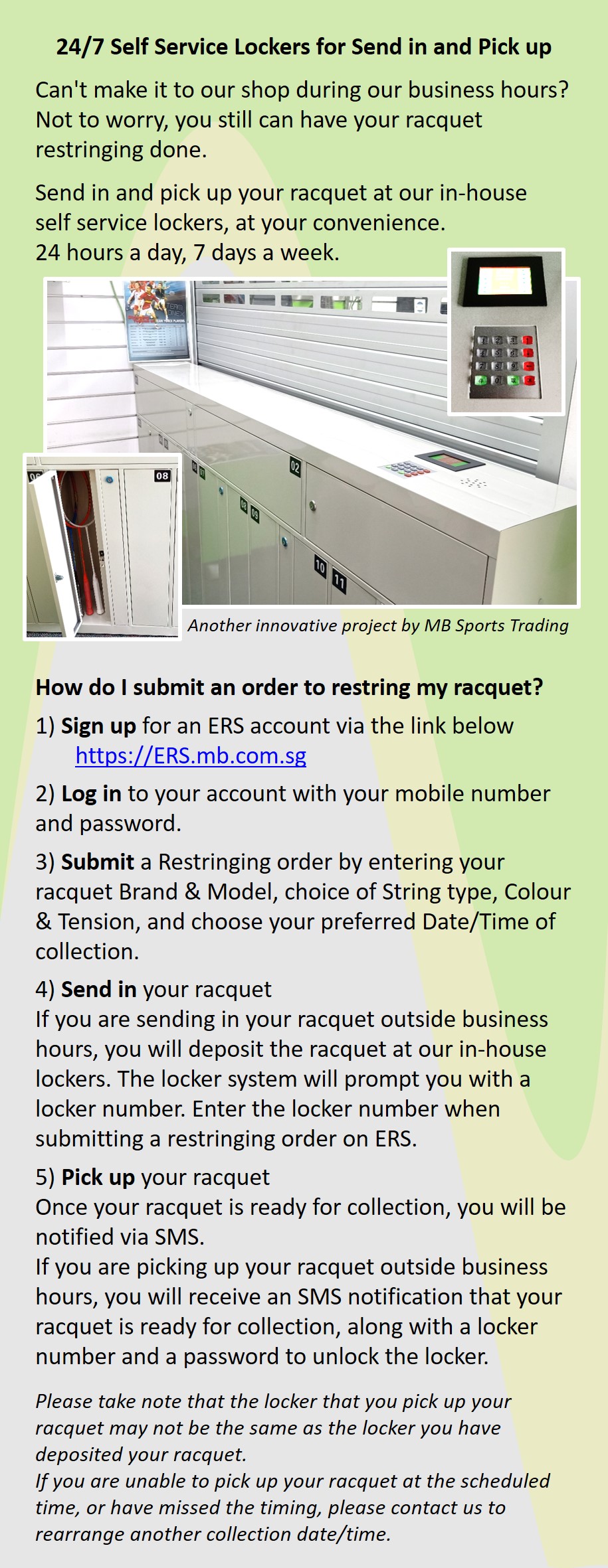 - Send in and Pick up racquet using 24/7 In-House self service locker.